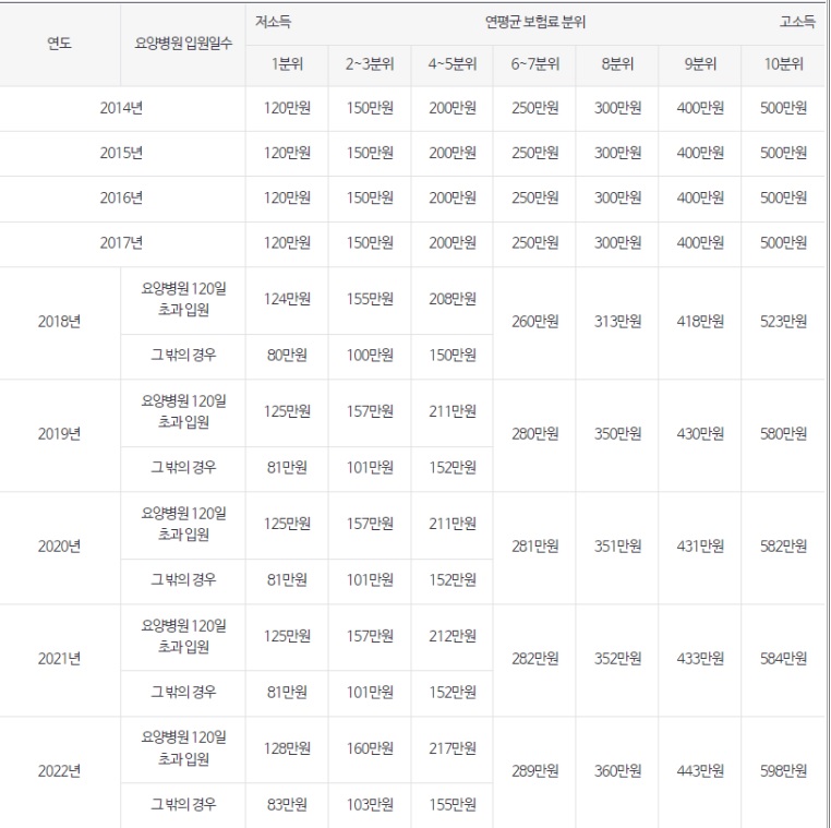 개인별 상한액은 직장가입자의 전년도 보험료 연말정산(매년 4월말), 개인사업장 대표자의 종합소득신고(매년 6월 말) 시기를 고려하여, 매년 8월경 연평균 보험료를 산출하여 본인부담상한액을 결정하게 됩니다.