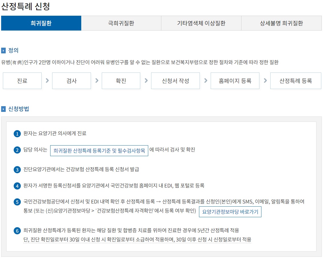 희귀질환자로 확진받은 자가 등록절차에 따라 국민건강보험공단에 신청한 경우 본인부담률을 10%로 경감하는 제도입니다.