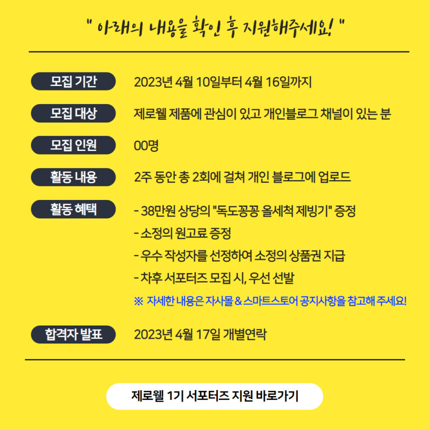 나도 서포터즈! 제로웰 [독도꽁꽁 올세척 제빙기] 서포터즈 by 블루지기 2023. 4. 13. 반응형 반응형 공유하기 게시글 관리 J's 꿀단지 저작자표시 비영리 변경금지 (새창열림) 댓글
